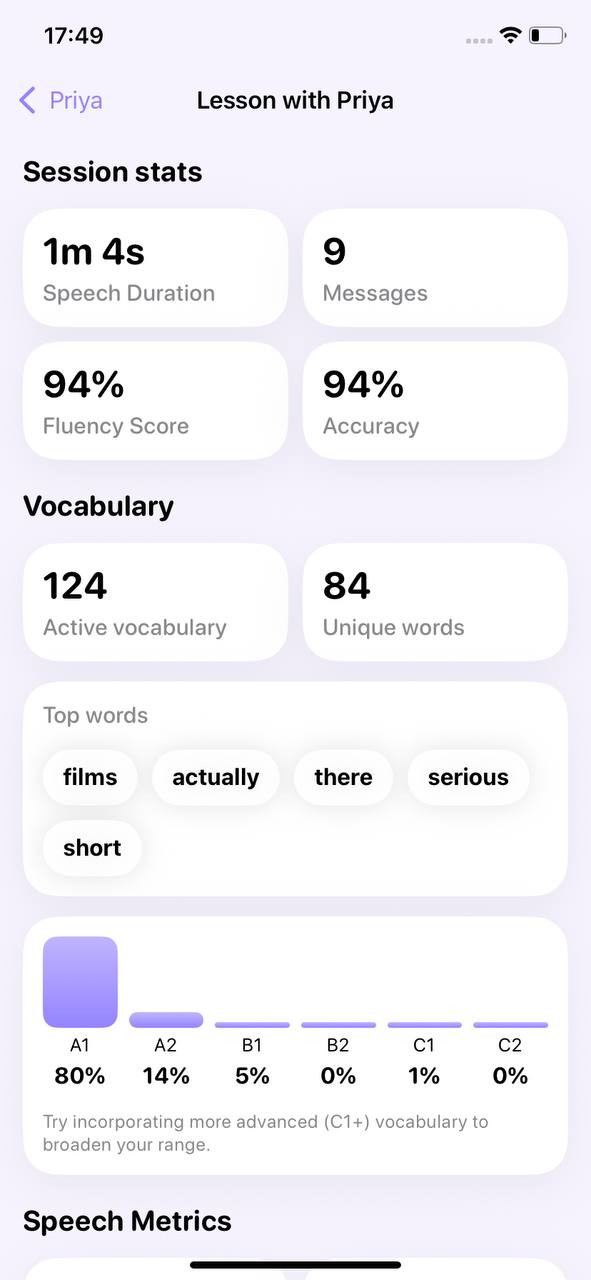 "The detailed analytics are incredible! I can see exactly where I need to improve and track my progress over time. It's like having a personal language coach."